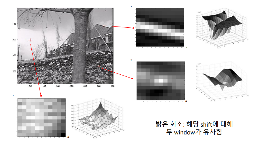 Flat, Edge, Corner에 해당하는 특징점에서의 Patch를 기반으로 구한 $E_{AC}(\Delta u)$를 $ \Delta u$를 변화시키면서 구한 그래프로, $E_{AC}(\Delta u)$의 함수 분포라고 할 수 있다. Flat한 부분의 경우 전반적으로 밝은 화소를 보이는데, 차이가 거의 없음을 의미한다. Edge의 경우 특정한 방향으로 밝은 분포를 보이는데, 해당 방향이 Edge와 평행한 방향이다. Corner의 경우 전 방향으로 어두운 분포를 보임을 확인할 수 있다. 즉, 인접한 영역과 차이가 있는 Unique한 특징을 보인다.