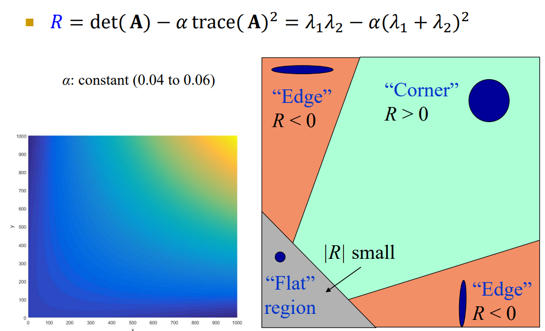 $R$은 $A$ Matrix의 det()와, trace()로 계산된다. 이때, 어떠한 Matrix의 det()는 두 Eigen Value의 곱, trace()는 두 Eigen Value의 합으로 계산된다. 이때, $\Alpha$는 가중치로 일반적으로 0.06을 사용한다. 따라서 R을 Eigen Value에 따라 Plot한 결과를 보면 왼쪽 하단의 그림이 된다. 결국 두 Eigen Value가 커야지만 $R$이 큰 값이 나옴을 확인할 수 있다. 따라서 Corner에 대한 기준을 Eigen Value가 아닌 $R$로 판단할 수 있게 되었다.