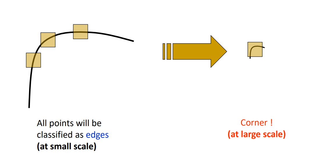 단점은 Scale에는 무관하지 않다는 점이다. 영상의 Scale이 작은 왼쪽의 경우, Patch의 변화에도 변화량이 적기 때문에 Edge로 불류된다. 하지만 영상의 Scale이 커지면, 해당 부분이 패치 내에서 Corner로써 검출됨을 확인할 수 있다. 이처럼, Scale에 의존적이기 때문에 크기가 다른 두 물체의 Feature Matching에는 한계가 있다.