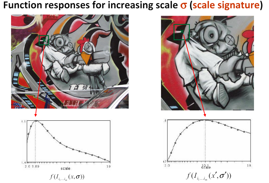우리는 Scale에 불변하는 Feature Detection을 하고 싶다. 그렇기 위해서는, 해당 Feature의 $\sigma$정보를 알고 있다면, Normalization을 통해 Scale이 다른 두 영상에서 동일한 Feature를 추출하여 Matching 시킬 수 있을 것이다. 이때의 $\sigma$는 Scale을 의미하는데, 해당 Scale에서 가장 큰 Response를 보이는 Scale이 $\sigma$이다.