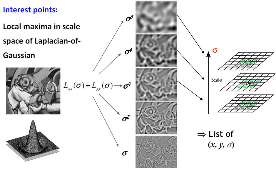 오른쪽 원본 사진을 $\sigma$를 변경 시켜 가면서 LoG를 적용한 결과가 가운데로, 위로 갈수록 Scale이 큼을 알 수 있다. LoG는 Band Pass Filter이기 때문에 $\sigma$가 커질수록 저주파 쪽으로 Band가 이동하기에 Large Scale Edge 즉, 확실하고 두꺼운 Edge에서의 Response가 증가하게 된다. 따라서 각 층에 대하여 3차원 NMS를 적용한다면, Local Maximum을 추출할 수 있고, 따라서 Scale, Position 정보를 추출할 수 있다.