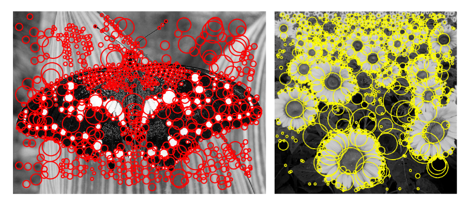 실제로 왼쪽 나비 영상을 $\sigma$에 따른 LoG의 Response는 오른쪽과 같다. 따라서 인접한 층에 대하여 NMS를 적용한 뒤 최종적으로 blob을 추출한 결과는 아래와 같다.