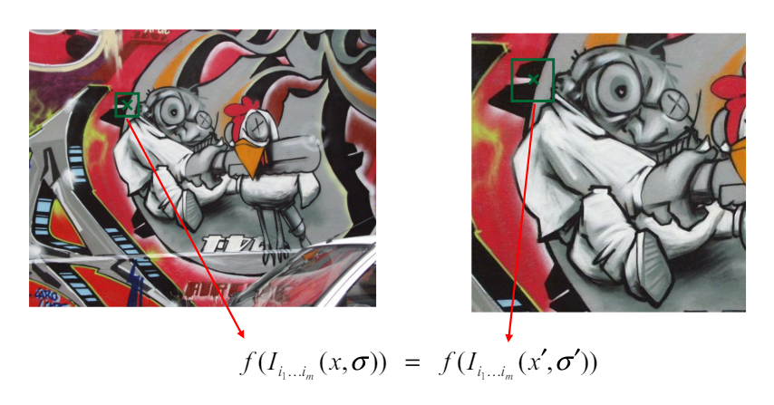왼쪽 사진에서 초록색으로 표시된 Feature에 대한 Feature Descriptor가 $f(I(x,\sigma)$라 하자. 이때, $x$는 Feature Location, $\sigma$는 Scale을 의미한다. 해당 영상에서 일부분을 확대한 즉, Scale이 커진 영상이 오른쪽과 같다고 하자. 그렇다면, 동일한 Feature에 대한 Location과 Scale 모두 변화 될 것이다. 하지만, Scale에 불변해야 하기 때문에 $f(I(x',\sigma')$는 $f(I(x,\sigma)$와 같아야 한다.