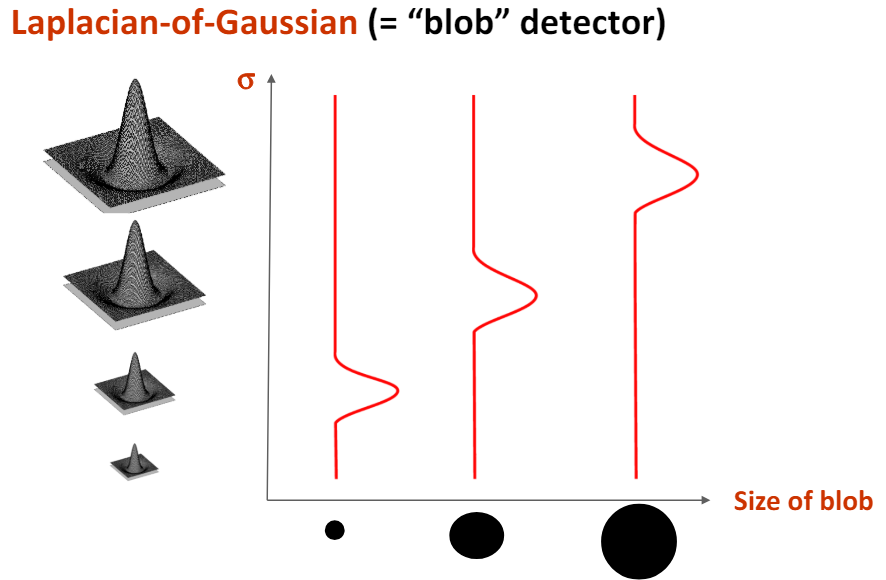 이때 Response를 구하기 위해서 사용되는 함수가 바로 Laplacia of Gaussian 이다. LoG의 $\sigma$에 따라 Peak점을 갖는 blob이 다르기 때문에, 즉, LoG를 통해 $\sigma$를 특정할 수 있다.