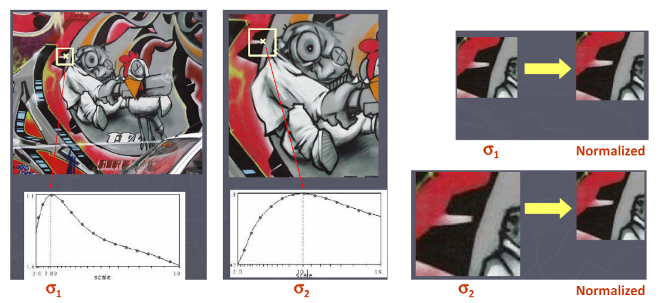 따라서 우리는 Scale에 불변하게 하기 위해 $\sigma$를 알고 있으므로 Normalization을 통하여 Scale이 다른 영상에서 동일한 Feature를 추출해 Matching시킬 수 있다.