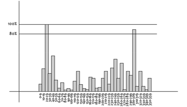 위와 같이 HoG가 계산되었다고 하자. 0~360 범위이기에 10씩 끊어서 계산한 결과이다. 20~29도가 가장 빈도수가 높기 때문에 해당 Keypoint의 Orientation으로 설정한다. 이때, Peak점 즉, 가장 높은 분포를 가지는 Orientation 빈도수의 80%를 넘기는 방향에 대해서도 또다른 Keypoint로 고려된다. 즉 하나의 Location에 대하여 서로 다른 Orientation을 가지는 서로 다른 Keypoint가 결정 될 수도 있다.