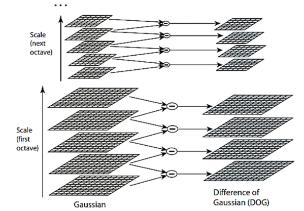 오른쪽 LoG의 $\sigma$에 따른 영상의 크기를 살펴보자. 여기서 Octave라는 개념이 나오는데, 이는 영상의 크기가 동일한 집단을 의미한다. 한 Octave에 현재는 5개의 영상이 존재한다. 그리고 다음 Octave로 넘어가면서 영상의 Size가 $\frac{1}{2}$가 되어 전체 크기는 $\frac{1}{4}$가 된다. 이때, 이전 Octave에서 사용한 $\sigma$ 값이 재사용 되면서 점진적으로 $\sigma$값이 커져 연산량이 과도하게 커지는 것을 막아준다.