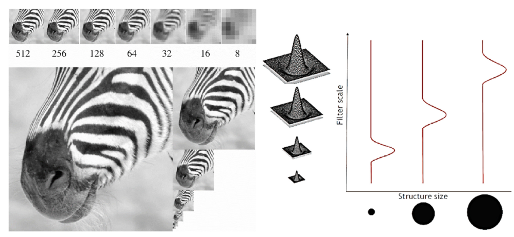 SIFT의 첫번째 아이디어가 등장하는데, 바로 연산량이다. blob Detection을 위한 LoG의 $\sigma$를 변화시켜 가면서 Filtering을 하는 과정은, $\sigma$가 커질수록 많은 연산량이 요구된다. 따라서 $\sigma$를 무작정 키우는 것이 아닌, 일정한 증가가 이루어 진다면, 영상의 크기를 축소시켜 연산량을 감소시키는 것이다.