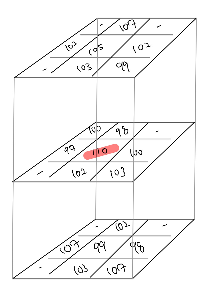 일종의 예외처리라고 생각하자. 먼저 NMS로 추출된 Keypoint 중 인접픽셀과의 차이(대조)가 적은 경우는 제외시킨다. 예를들어 오른쪽과 같은 3차원 NMS가 적용되어 Keypoint로 가운데 층의 가운데 픽셀이 위치되었다고 하자. 물론 Local Maximum이 맞지만, 인접 픽셀과의 차이가 적기 때문에 Local Feature로는 부적절하다.