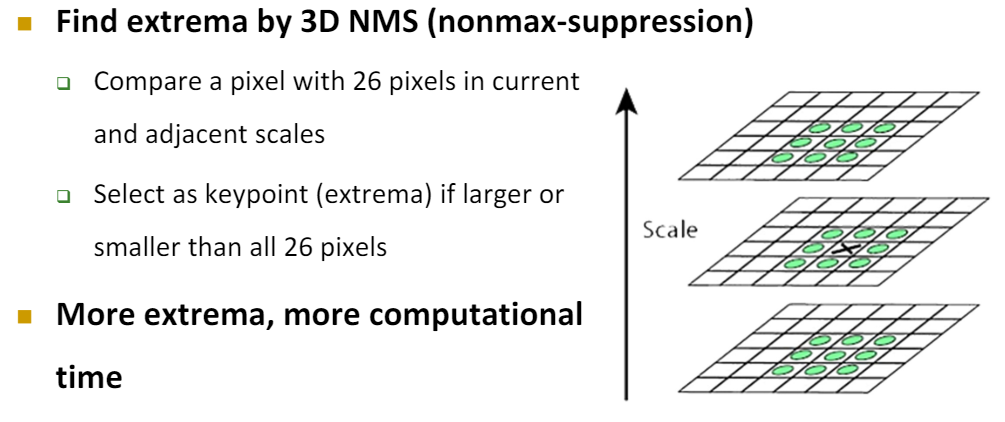 이렇게 추출된 Local Feature의 가능성이 있는 keypoint들에 대하여 3차원 NMS를 적용하여 Local Maximum을 추출한다. keypoint를 기준으로 8개의 Pixel, 인접한 두 층의 동일한 영역의 9개의 Pixel 총 26개의 Pixel에 대하여 NMS를 적용하면 된다. 하지만, 이 역시 수많은 연산과 비교가 이루어 지기 때문에 많은 연산량이 요구된다. 따라서 Keypointd의 위치를 정확하게 하기 위한 다른 접근법이 등장한다.