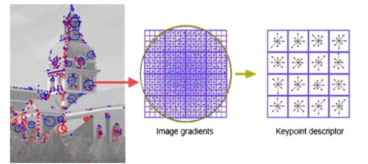 가운데 Image Gradients를 기반으로 우리는 앞서 Keypoint의 Orientation을 결정하였다. 하지만, 그것만으론 해당 Keypoint를 정량화 할 순 없다. 따라서 등장한 개념이 SIFT Descriptor이다. 먼저 Keypoint를 기준으로 16by16 Window를 생성한다. 이를 4by4로 Sub Region이 나눈다. 이후 16개의 작은 윈도우에 속한 Pixel들의 Gradient의 크기와 방향을 계산한 뒤 8개의 bin을 가지는 즉, 8 Orientation Histogram을 그린다.