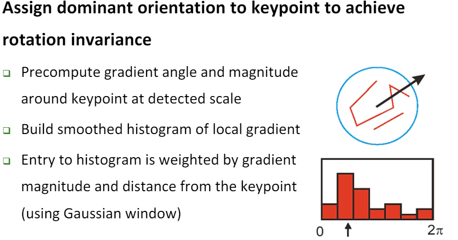 우리는 blob을 추출하였기에, 해당 Keypoint의 Scale 요소인 $\sigma$를 알고 있다. 따라서 Keypoint의 $\sigma$에 따른 범위 내의 Gradient와 Magnitude를 계산하고, Hog(Histogram of oriented Gradient)를 계산한다. 즉, 영역 내의 Gradient를 Count하여 가장 빈도수가 높은 Gradient를 해당 Keypoint의 Orientation으로 설정한다. 이때, Gradient Magnitude와 Keypoint와의 Distance에 따른 Weight를 부여하여 HoG를 계산한다. 따라서 Gaussian Window가 사용된다.