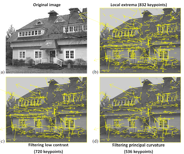 또한, Edge 상의 Keypoint를 제거하기 위해 hessian Matrix와 아래의 공식이 도입되었다. 너무 깊게는 들어가지 말고, Hessian Matrix의 det(), trace()의 비율을 기반으로 해당 Keypoint가 Edge상에 존재하는지 판단한다고만 기억하자.