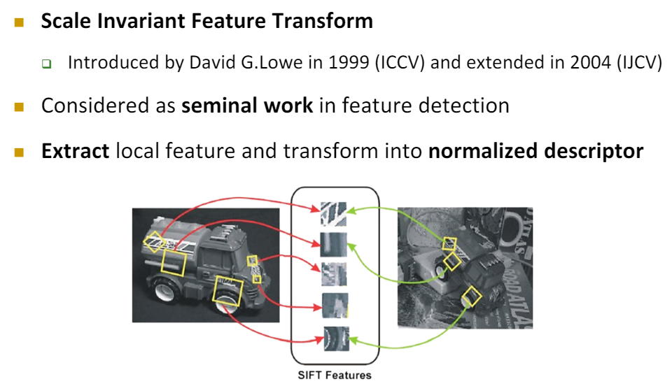 SIFT는 Scale Invariant Feature Transform의 약자로, 말 그대로 Scale에 불변하는 특징 추출을 위한 변환을 의미한다. 아래 그림에서 왼쪽은 원본 이미지, 오른쪽은 트럭이 Scale, View Point 변환으로 인한 Rotation이 나타남을 알 수 있다. SIFT는 Local Feature를 추출하고 Normalized Descriptor로 변환하여 Scale에 불변하는 Feature를 추출한다.