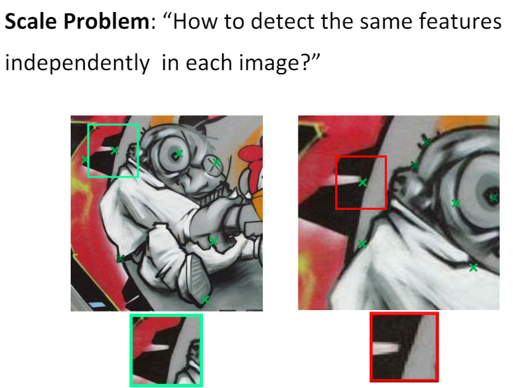 지난 포스팅에서 한 이야기를 잠깐 다시 해 보겠다. 원본 영상에서의 Local Feature는 Scale이 변화된 이미지에서 동일한 크기의 Patch를 고려한다면, 동일한 Feature에 대해서도 Description의 차이가 존재하여 Feature Matching이 불가하다. 하지만, 오른쪽과 같이 Scale에 따른 Patch의 크기가 달라진다면 즉, Scale이 고려된다면, Scale에 불변한 Local Feature를 추출할 수 있다.