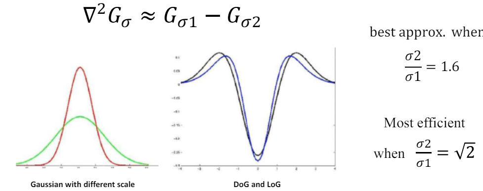 가운데 DoG와 LoG의 그래프를 보면 매우 유사함을 확인할 수 있다. 따라서, LoG를 DoG로 근사시켜 사용하는데, 이때 인접한 두 층의 $\sigma$의 비율인 $\frac{\sigma2}{\sigma1}$가 $\sqrt{2}$인 경우 가장 효과적이기에 인접한 두 층의 $sigma$의 비율이 $\sqrt{2}$로 설정된다.