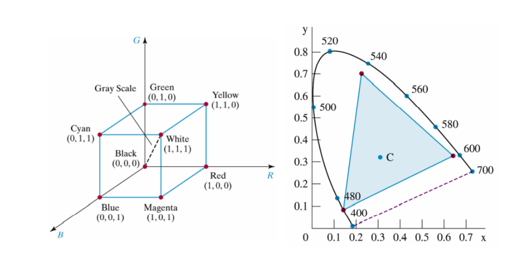 RGB Color 공간을 CIE 다이어그램에 매핑 해 보면, 오른쪽 과 같이 표현할 수 있는 색상 공간(Color Gamut)이 형성된다. 따라서, RGB Color Model 만으론 CIE에서 표현 가능한 모든 색상을 표현할 순 없지만, 실용적인 측면에서는 대부분의 색상을 표현 가능하기에 주로 사용된다.
