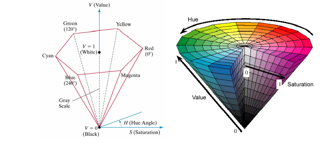 $H$는 Hue(색상)으로, 오른쪽을 보면 인간이 인식하는 색상 자체를 결정한다. $S$는 Saturation(채도)로, 바깥으로 갈수록 색을 명확하게 가지고 있고, 안으로 갈수록 색 자체를 잃어버려 흰색을 띄는 것을 확인할 수 있다. 즉, 해당 색상의 선명도를 결정한다. 마지막으로 $V$는 Value(명도)로 위로 갈수록 밝아지고, 아래로 갈수록 검은색이 된다. 즉, 해당 색상의 밝기를 결정한다.