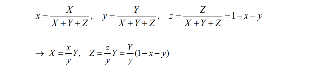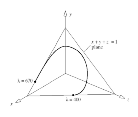 하지만 Basis의 가중치 $ X,Y,Z $를 직접 계산하는 것은 어렵기 때문에, 이를 Nomalization 한 것이 $x,y,z$이다. Nomalization 되었으므로 $x,y,z$ 중 2개만 알아도 나머지 하나는 결정되어 색상을 표현할 수 있기 때문에 2 자유도를 가진다. 또한, $x,y$는 chromaticity values라고 불리는데, 이는 $X, Z$가 밝기값을 무시한 색상이며, 밝기는 $Y$에 의해 결정되기 때문이다.