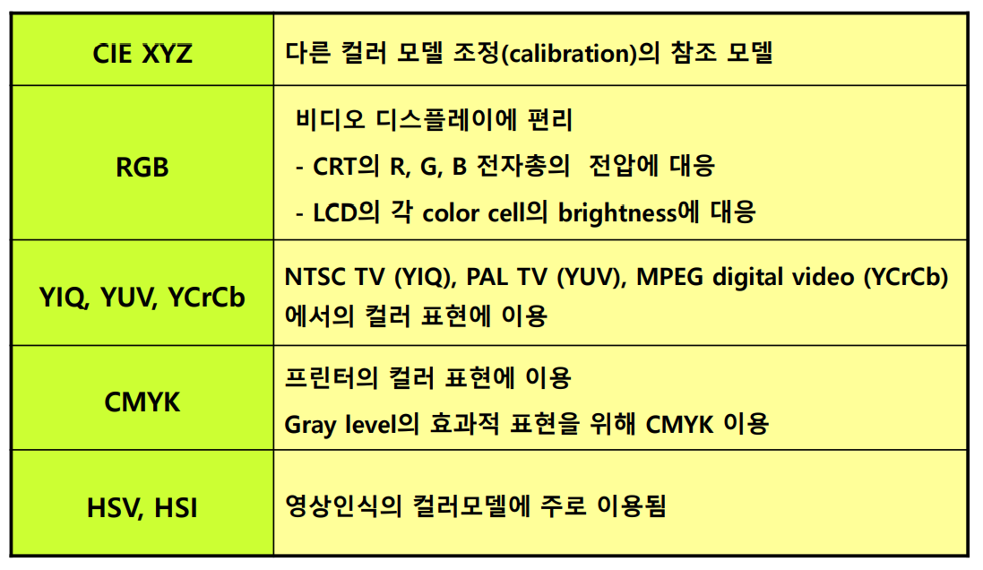 YIQ와 유사하나, PAL 방식(유럽식)의 Color TV에서 사용하는 YUV Model, Digital로 넘어오면서 JPEG, MPEG 등 디지털 영상에 사용된 YCrCb Model, YCrCb의 아날로그 버전인 YPrPb Model 등이 있는데 가볍게 넘어가자.