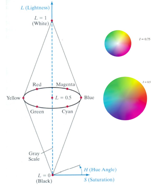 HSV와 비슷한 색상 모델인 HSI Color Model은 Value대신 $I$ Intensity가 추가되었다. Value는 인지적인 밝기를 의미한다면, Intensity는 "밝기"를 나타내는 수치 즉, 계산을 통한 밝기 값을 의미한다. $I = 0.5$일 때, Pure한 색상 즉, 다른 색상이 섞이지 않은 순수한 색상을 얻을 수 있으며, $H$의 각도에 따라 색상이 결정된다. 또한, $S = 0$일 때, Gray Scale의 색상이 표현된다.