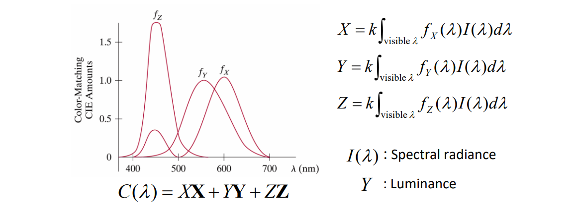 앞서, 다양한 색상을 Primary Color의 Linear Combination으로 표현한다고 하였다. CIE XYZ Color Model에서도 Basis인 $X,Y,Z$의 Linear Combination으로 색상 $C(\lambda)$를 표현한다. 이때, 각 Basis의 Coefficient(Weight, 성분)은 오른쪽 수식을 기반으로 계산하는데, 이는 현재 들어오는 빛에 대하여 각 Basis에 해당하는 성분을 계산하는 수식이다.
