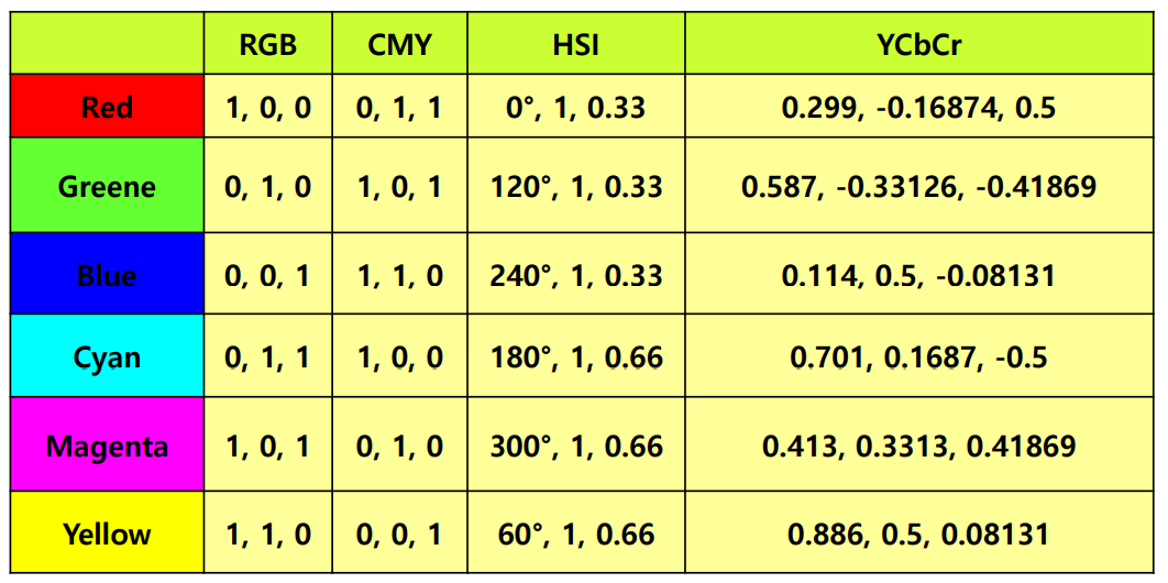 RGB 색 공간에서 HSI로 넘어가는 과정은 $H$의 각도에 따른 cos, sin 계산이 들어가기 때문에 Non Linear함을 알 수 있다. 하지만, YCbCr의 경우 RGB에 대한 Value가 G+B인 Cyan을 표현할 때 Linear 한 연산을 기반으로 계산되기 때문에 Linear함을 확인할 수 있다.