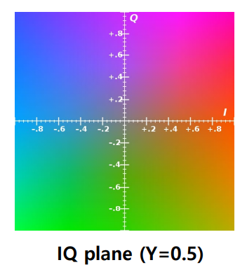 과거 흑백 티비를 사용할 때는 $Y$ 신호 즉, 밝기 신호만 사용하였다. 흑백에서 컬러로 넘어오면서 호환성을 유지하기 위해 $Y$를 사용하면서 $I, Q$가 추가된 색 공간이 YIQ Color Model이다. 오른쪽과 같은 $IQ$ Plane이 형성되는데, $I$는 Orange-Cyan을 표현하고($I$가 클수록 Orange - 사람의 피부 톤 표현), $Q$는 Green-Magenta 색상을 표현한다. 이는, NTSC 방식의 Color TV에서 사용된 색상 모델이다.