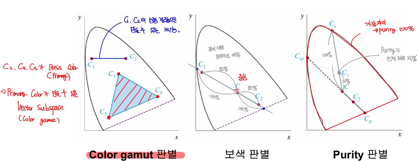 원색이 $C_3, C_4, C_5$로 주어졌다고 하자. 그렇다면, 원색의 선형 결합으로 만들 수 있는 Vector SubSpace는 원색을 CIE Diagram에서 원색을 연결하여 생기는 평면상에 존재하는 색상이기 때문에, 빗금친 영역이 된다.