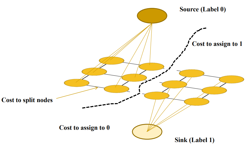 Graph의 구조는 Source Node와 Sink Node가 모든 노드에 연결되어 있고, 각 간선은 각 노드들이 0과 1일 확률을 의미한다. 또한, 픽셀에 해당되는 각 노드들은 Graph Cut에 의해 Node들이 분리될 때의 Cost가 할당된 간선으로 이어져 있다. 즉, 인접한 영역의 픽셀을 고려하여 Cost가 할당된다.
