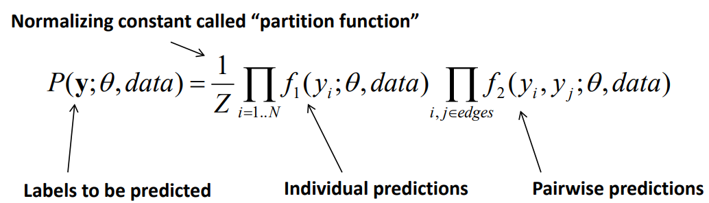영상은 공간적 연속성을 보장하기 때문에, 인접한 화소를 고려하여 조건부 확률을 적용하면 된다. $y_i$는 각 화소에 부여되는 Label이며 0이면 배경, 1이면 전경을 의미한다. 따라서 $f_1(y_i; \theta, data)$는 해당 알고리즘의 Parameter $\theta$, Input Data $data$가 주어졌을 때, 특정 픽셀의 Label이 $y_i$인 독립적인 확률이다. 이를 모든 영상에 대해서 반복한다. 또한, $f_2(y_i,y_j; \theta,data)$는 모든 edge에 속하는 i,j에 대하여 i pixel에서는 $y_i$, j pixel 에서는 $y_j$ Label을 가질 확률을 의미한다. 즉, 인접한 영역의 픽셀(인접 화소)를 고려하여 특정 Label을 가질 확률을 의미한다. 여기서 말하는 Edge는 인접 픽셀과의 관계라고 생각하는게 좋다.