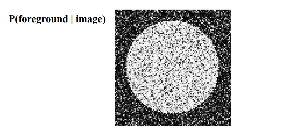 조건부 확률 개념을 조금 적용하여 위 영상을 생각 해 보자. 영상에서 전경일 확률을 1(255), 배경일 확률을 0(0)으로 표현한다고 생각 해 보자. 이상적인 결과는 원형인 전경 내부는 완벽한 흰색을, 배경은 완벽한 검은색으로 표현되어야 하지만, Nosie가 많이 발생함을 확인할 수 있다. 이때, Noise는 잘못된 확률 추정을 의미한다.