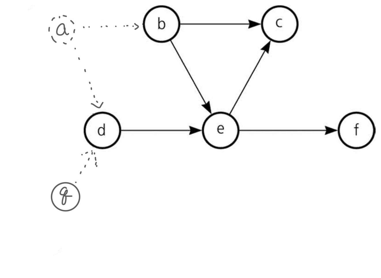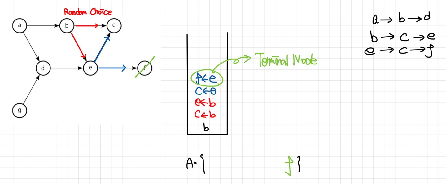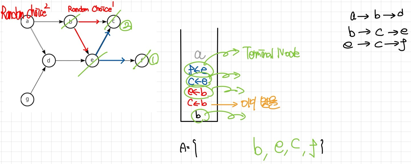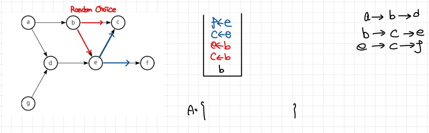 현재 위와 같은 상황이다. $a,g Node$는 이미 방문한 상황이므로 각 Node와 진출 간선은 모두 방문(제거)한 상황이다. 현재 $b, d Node$ 모두 진입 간선이 0개이므로 Random Choice하여 $b Node$를 선택하였다.
