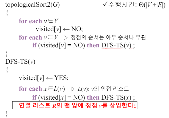 - 더 이상 방문할 Node가 없는 경우 해당 노드를 $A$ 리스트의 앞에 추가