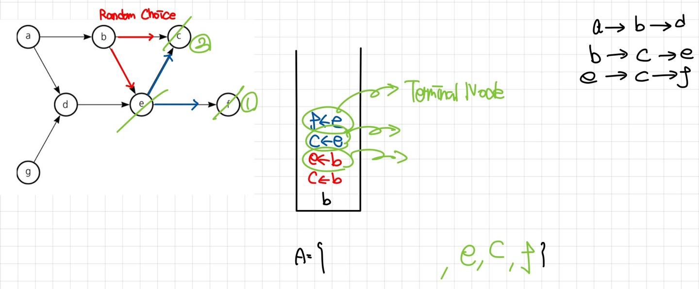 Random Choice를 하여 $b Node$를 선택했다고 하자. DFS를 수행하면 순서가 중요하기 때문에, $c, e$순서데로 stack에 쌓인다. 우리가 알고 있는 DFS는 다음으로 stack에 top에 있는 $e Node$를 빼내면서 방문했다고 처리하지만, Topological Sorting에서는 $e Node$는 Stack에 놔두고, $e Node$에서 방문 가능한 Node들을 stack에 추가한다.