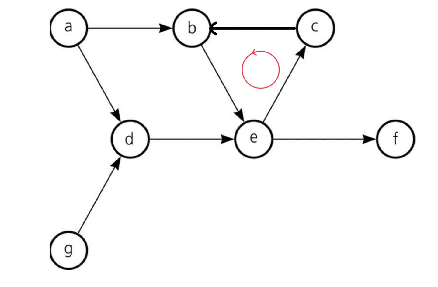 왼쪽 그래프가 DAG에 해당된다. 만약 $b Node \to c Node$의 방향이 반대면, 오른쪽과 같이 Cycle이 발생하게 된다. 이와 같은 Cycle이 존재하는 유향 그래프에서는 Topological Sorting을 적용할 수 없다.