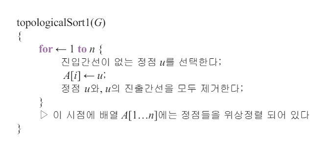 특정 노드로 들어오는 간선을 진입간선, 특정 노드에서 다른 노드로 나가는 간선을 진출간선이라 하자. 첫번째 Algorithm은 진입 간선이 없는 노드 $u$를 선택한다. $u Node$를 방문했음을 표현하기 위해 $A$ Array의 i번째 Index에 $u$를 집어 넣는다. 그리고 $u Node$와 $u Node$의 진출간선을 DAG에서 제거한다. 이를 모든 Node를 방문할 때 까지 반복한다.
