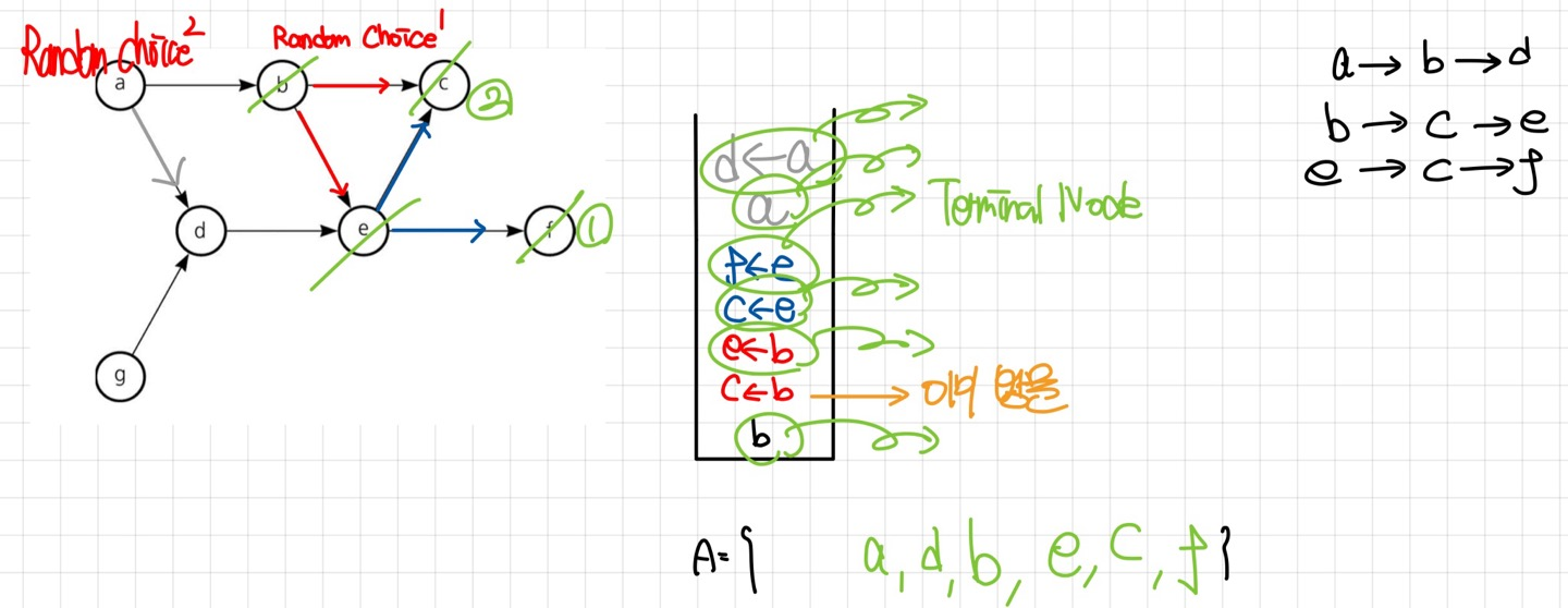 두번째 Topological Sorting 알고리즘을 정리하자면, 모든 Node 중 Random Choice하여 해당 Node를 기준으로 Terminal Node까지 DFS를 수행한다. Terminal Node에 대해서만 방문한 뒤, 순서를 저장하는 배열의 앞부분에 추가하고 역추적한다. 역추적 과정에서 방문 가능한 다른 노드가 있다면 방문한다(DFS). 이 과정을 방문하지 않은 전체 노드에 대하여 반복적으로 수행하는 것이다.