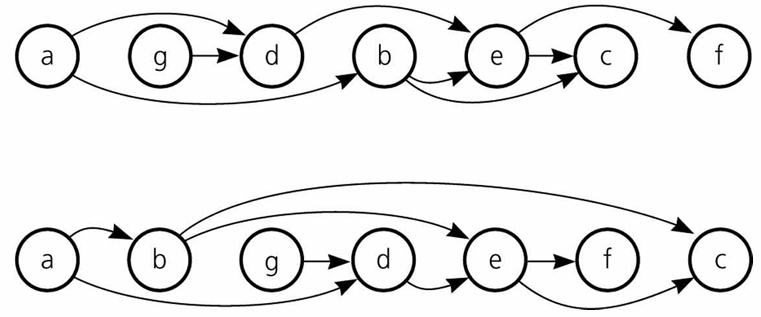 위에서 언급한 DAG에 대한 위상정렬 중 2가지이다. $a Node$와 연결된 노드가 $b,d Node$이기 때문에 그에 따라 순서가 다르게 정렬됨을 확인할 수 있다.