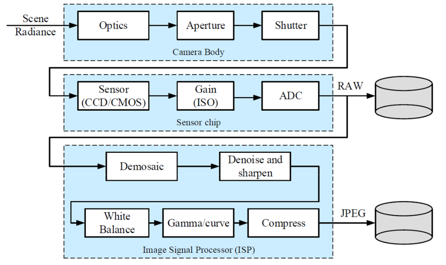 Camera Sensor가 영상을 취득하는 과정이다. 여기서 Radiance라는 개념이 등장하는데, Radiance(복사휘도)는 앞서 설명한 휘도(Luminance)라고 이해하면 되는데, 광원에서 나온 빛이 물리적인 3차원 Scene에서 반사되어 발산되는 Energy이다. Scene, Radiance가 Camera Body로 들어오면 카메라 센서로 빛이 들어와서 위와 같은 Pipeline을 거쳐 우리가 아는 영상이 만들어진다. 따라서 우리가 실제로 다루는 정보는 Irradiance(복사조도)로, 카메라의 센서(특정 면적)에 도달하는 빛의 정도이다