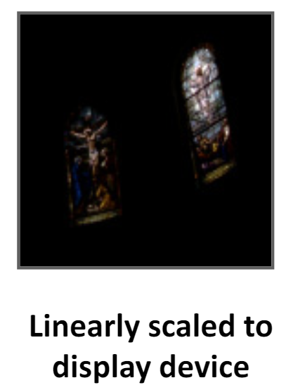 Dynamic Range를 줄이기 위하여 단순히 Linear하게 줄여보자. HDR의 낮은 Energy를 0, High Range를 1로255로 할당하여 선형적으로 줄이게 된다면 오른쪽과 같은 결과가 나온다. High Energy 영역만 표현되고 나머지는 모두 검은색을 띄는것을 알 수 있는데, 이는 대다수의 화소가 Low Energy를 가지지만, 이를 선형적으로 축소시켰기 때문에 모두 검은색으로 표현된다.