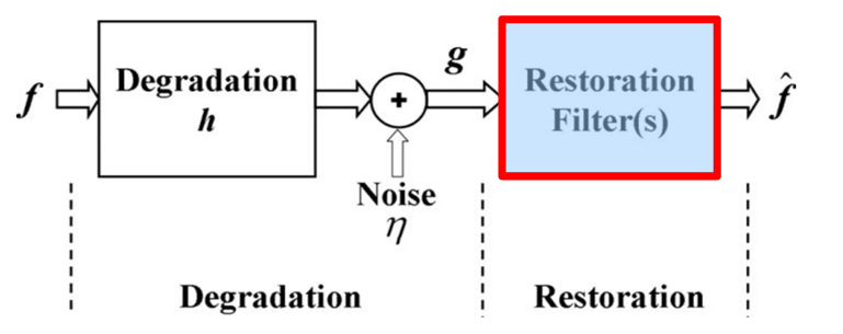 원본 영상 $f$에 대하여 Noise, Blur 등을 발생시키는 것이 아닌, 이미 품질이 저하된 영상 $g$에 대하여 Restoration을 통해 원본 영상을 추정($\hat {f}$)하는 Inverse Problem이다.