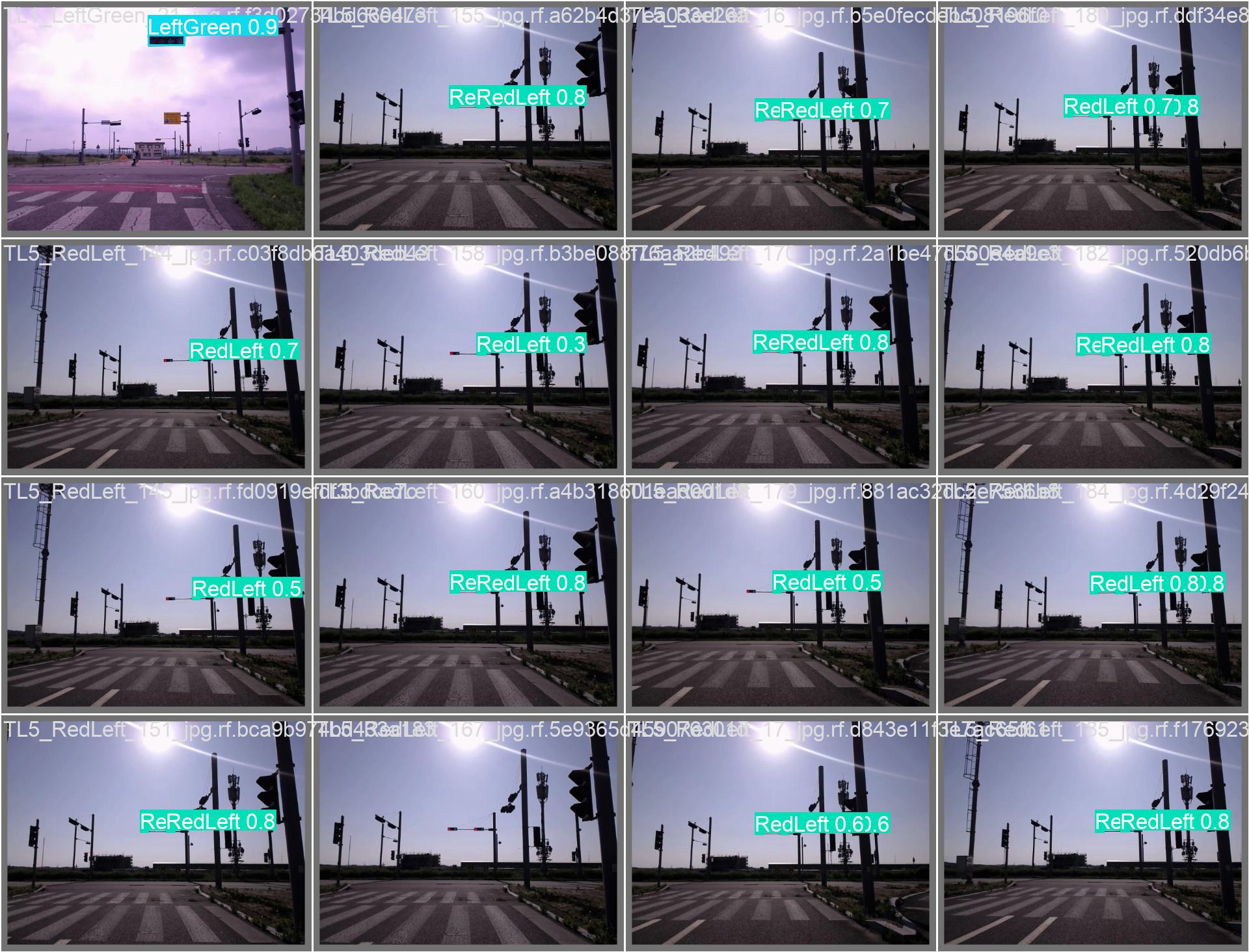 ERP-42 차량 전방에 부착한 Camera로 취득한 신호등 영상으로 Custom Dataset을 구축하였다. 차량이 실제 주행하는 환경에서 취득한 영상이기에 추가적인 Data Augmentation은 적용하지 않았다. Class는 총 6개로 Green, LeftGreen, Red, RedLeft, RedYellow, Yellow이다. 데이터 구성은 실제 차량이 신호등을 인식하여 정지하는 시나리오를 구성하여 취득하였고, 각 클래스당 데이터 수를 균등하게 하기위해 700개로 구성하였다. 이때, 학습 세트는 7:2:1의 비율로 Train, Test, Valid Data를 나누었다.