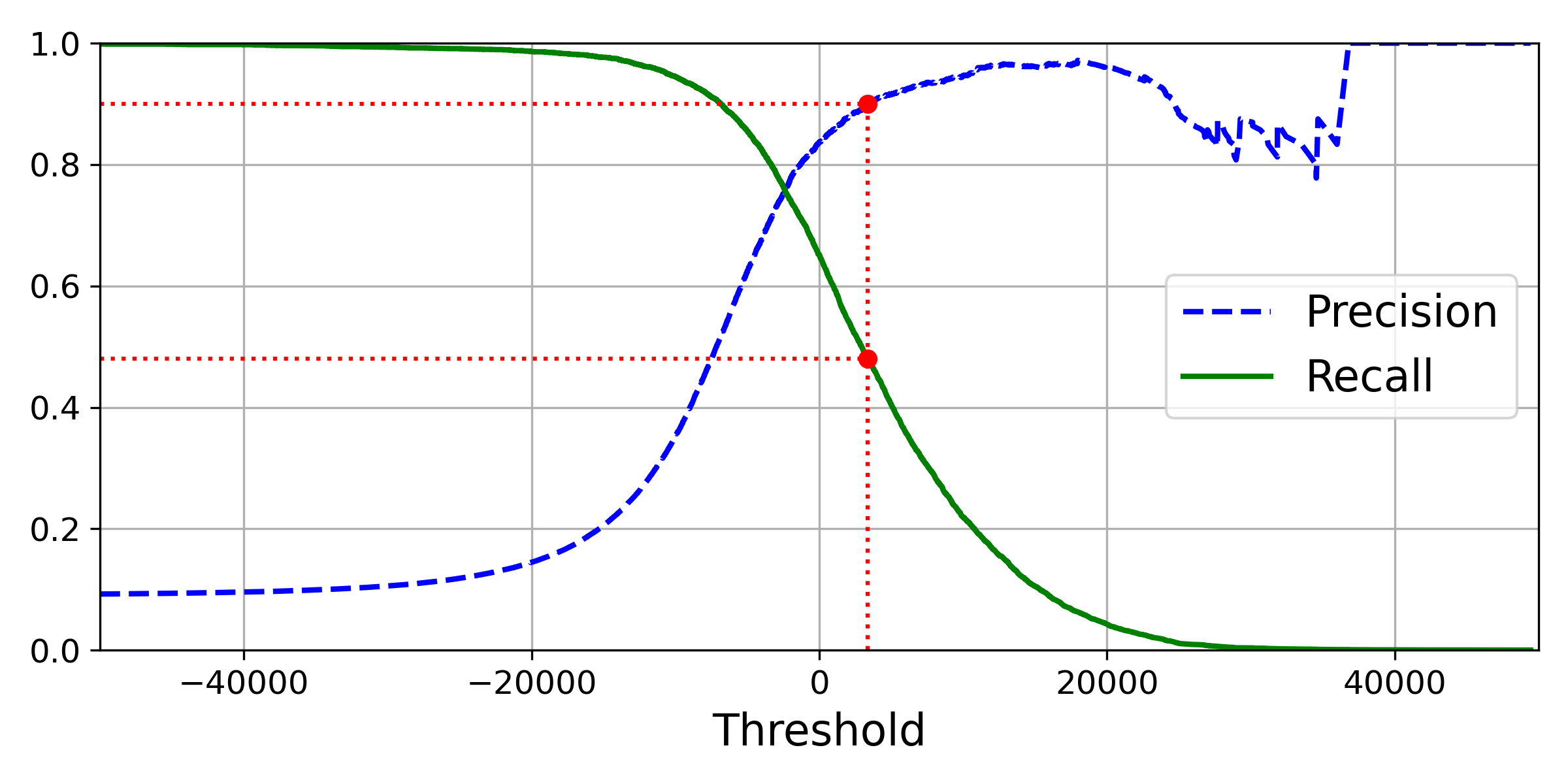 결과는 위와 같다. 여기서 빨간색은 정밀도가 90%일 때, 재현율과 임계값을 나타낸 것이다. 임계값이 커질수록, 재현율은 부드럽게 갑소하지만, 정밀도는 울퉁불퉁하는 것을 확인할 수 있는데, 이는 임계값을 올리더라도 정밀도가 일반적으론 올라가지만, 가끔 낮아질 때가 있기 때문이다.